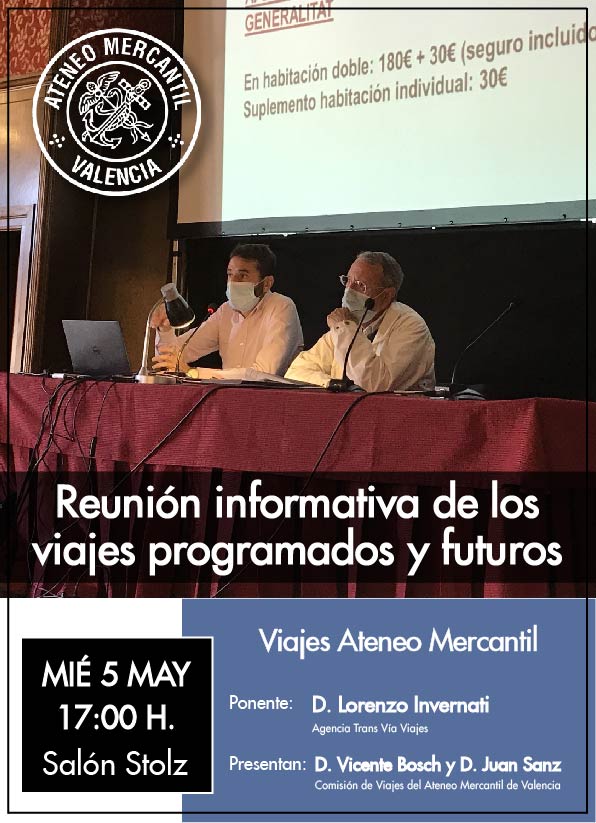 El próximo miércoles 5 de mayo a las 17 horas se realizará una reunión de la Comisión de Viajes del Ateneo Mercantil en el Salón Stolz para informar de todos los viajes, tanto para los ya programados del año anterior como para hablar de los próximos viajes a llevar a término. En la reunión estará Lorenzo de Viajes Trans Via, agencia de viajes con la que el Ateneo Mercantil realiza la mayoría de los desplazamientos. En la reunión, entre todos, se hablará de los viajes ya planificados y que están pendientes de hacer como de las salidas que se realizarán en el futuro cuando las restricciones por la pandemia desasparezcan.