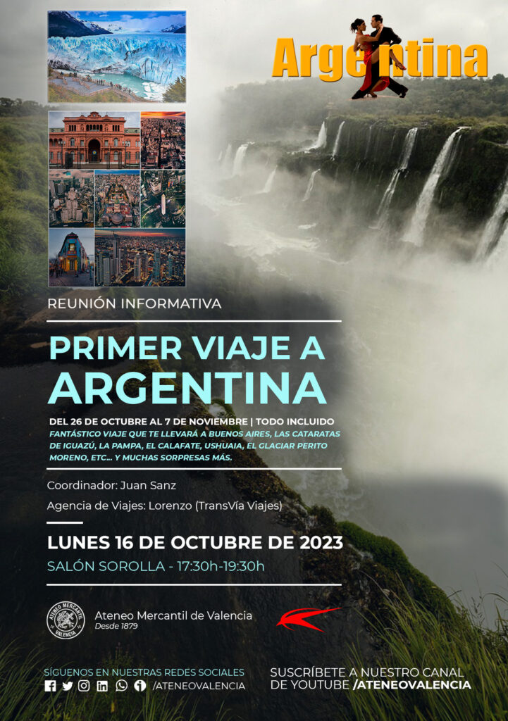 El Ateneo Mercantil de Valencia junto a TransVía Viajes han organizado una reunión informativa para el próximo lunes 16 de octubre a las 17 horas horas en el Salón Sorolla para informar del primer viaje que llevará a nuestros socios y acompañantes hasta Argentina. Seguidamente, a las 18.30 horas se reunirán los socios que vayan en el segundo viaje a Argentina.