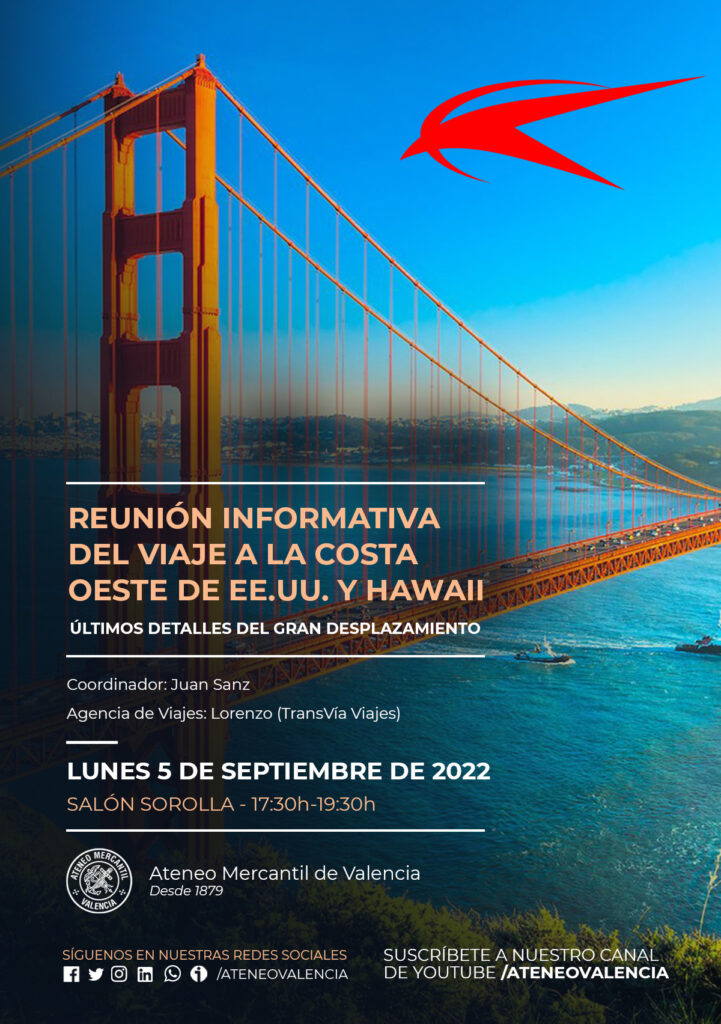 El Ateneo Mercantil de Valencia y TransVía Viajes organizan una reunión informativa que se celebrará el próximo lunes 5 de septiembre a las 17.30 horas en el Salón Sorolla para concretar todos los detalles del desplazamiento de nuestros socios a la Costa Oeste de los Estados Unidos y a Hawaii. Por parte del Ateneo Mercantil de Valencia estará el coordinador de viajes, Juan Sanz, mientras que le acompañará Lorenzo, de TransVía Viajes.