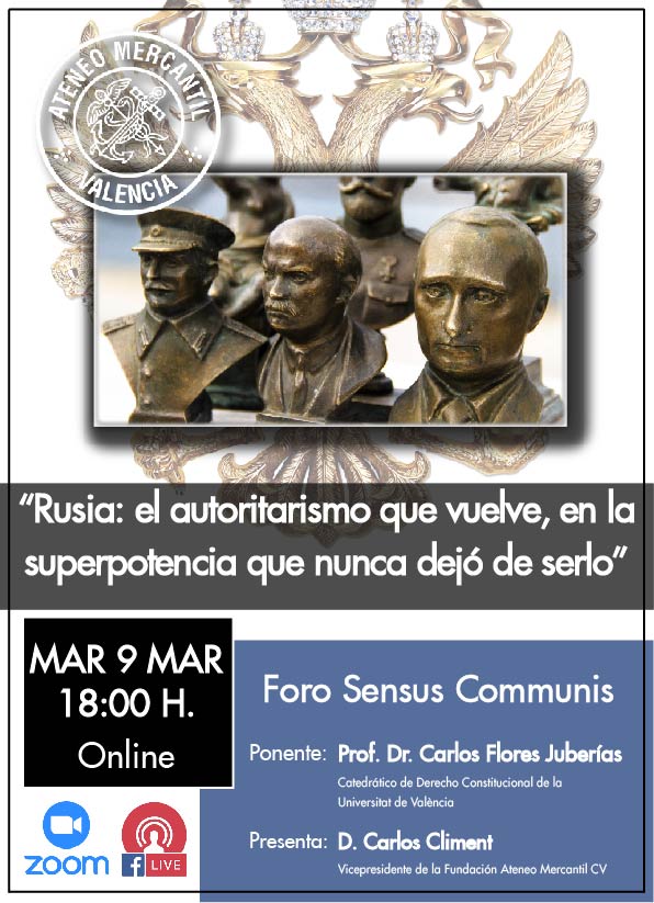 El Foro Sensus Communis se vuelve a reunir el próximo martes 9 de marzo a las 18 horas con una conferencia online que llega bajo el título "Rusia: el autoritarismo que vuelve, en la superpotencia que nunca dejó de serlo" y el ponente será catedrático de Derecho Constitucional de la Universitat de València, Prof. Dr. Carlos Flores Juberías.
