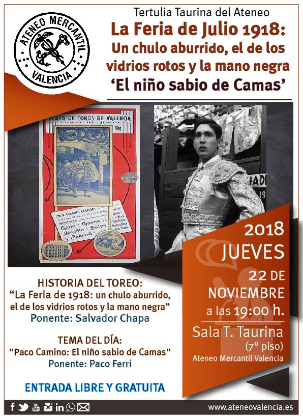 Este próximo jueves 22 de noviembre se celebra un nuevo encuentro de la Tertulia Taurina a la hora habitual, las 19.00 horas, en el séptimo piso del Ateneo Mercantil. De nuevo la tertulia contará con el socio D. Salvador Chapa que seguirá narrando fielmente la Historia del Toreo y prosigue con la Feria de Julio de 1918 y llega con el título: "Un chulo aburrido, el de los vidrios rotos y la mano negra". Asimismo, el socio D. Francisco Ferri, será el encargado de introducir el tema de las Figuras del Toreo, que está vez hablará de Paco Camino "El niño Sabio de Camas". Tras estas dos citas comenzará la habitual tertulia entre los compañeros taurinos.