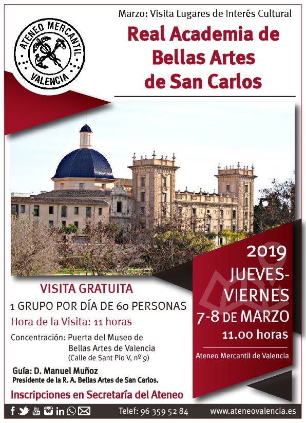 La segunda de las visitas culturales a la real Academia de Bellas Artes de San Carlos de este mes de marzo será el próximo viernes 8 de marzo a las 11 horas. 60 socios disfrutarán de una visita gratuita y guiada por parte del Presidente de la R. A. de Bellas Artes, D. Manuel Muñoz. La concentración será en la puerta del Museo de Bellas Artes de Valencia, en la calle San Pio V, nº 9. Las inscripciones se harán de manera presencial en Secretaría o bien por teléfono. La Real Academia de Bellas Artes de San Carlos es una institución académica cultural pública que fue creada en 1768 por el rey Carlos III y desde su fundación impartió las enseñanzas de Pintura, Escultura y Arquitectura. la Real Academia de Bellas Artes de San Carlos es la poseedora de los mejores cuadros del Museo de Bellas Artes, el segundo mejor museo de España.
