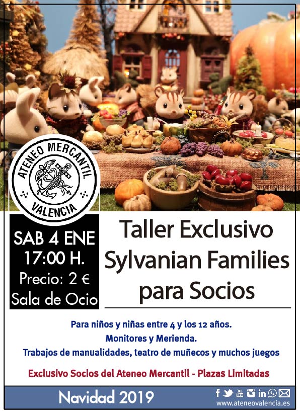 El Mundo Sylvanian Families que llega al Ateneo Mercantil con una gran exposición en el Salon Noble, la más grande de Europa, se completará con dos talleres exclusivos para los niños y niñas de los socios ateneístas que tengan entre 4 y los 12 años. La segunda de las sesiones de los talleres será el próximo sábado 4 de enero, de 17 a 20 horas en la Sala de Ocio, en el que estarán divirtiéndose durante tres horas y estarán perfectamente cuidados por monitores.