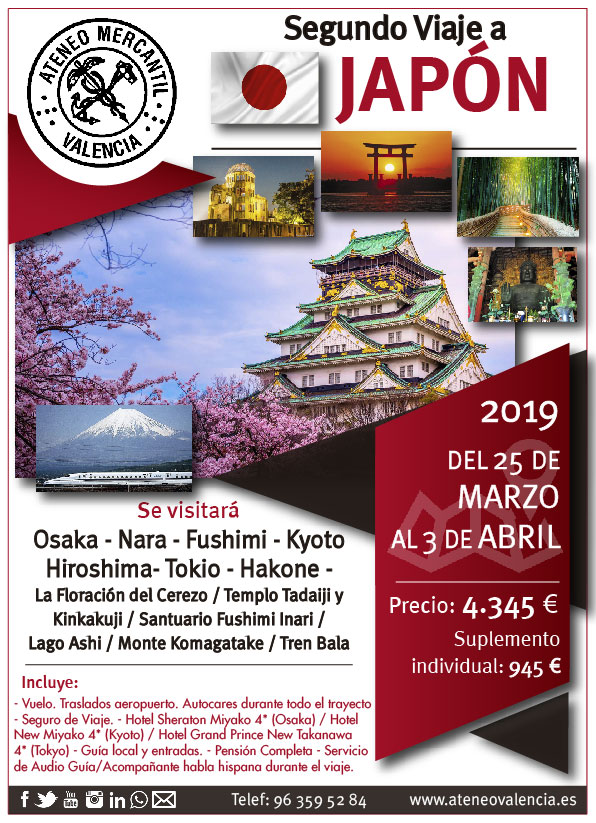 Los socios del Ateneo Mercantil de Valencia visitarán Japón en el momento de floración de cerezo, el instante más bonito para hacerlo. Así podrán visitar Osaka, Nara, Fushimi, Kyoto, Hiroshima, Tokio, Hakone, los Templos de Tadaiji y de Kinkakuji, el Santuario Fushimi Inari, el Lago Ashi y el Monte Komagatake. Además, se conocerá de cerca el Tren Bala.