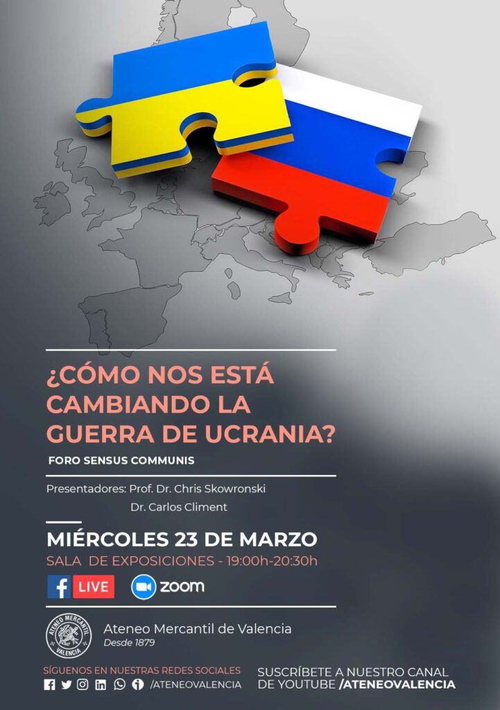 El Foro Sensus Communis se vuelve a reunir el próximo miércoles 23 de marzo a las 19 horas en la Sala de Exposiciones. Una sesión que será presencial y online, ya que los presentadores serán el Prof. Dr. Chris Skowronski, Profesor en el Departamento de Estudios Culturales de la Universidad de Opole, y Manager de asuntos científicos del Berlin Practical Philosophy International Forum y el Dr. Carlos Climent, Vicepresidente de la Fundación del Ateneo Mercantil de CV.