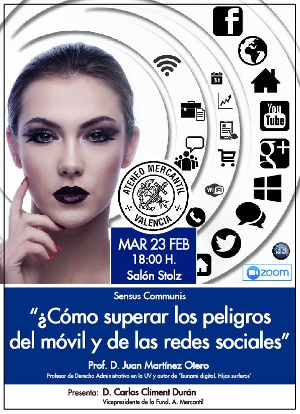 El Foro Sensus Communis ha programado una nueva reunión para el próximo martes 23 de febrero a las 18 horas en las que se tratará un tema de actualidad como es el riesgo del móvil y las Redes Sociales. Una conferencia online que llega bajo el título: "¿Cómo superar los peligros del móvil y de las redes sociales?" y que impartirá el profesor de Derecho Administrativo en la UV y autor de 'Tsunami digital. Hijos surferos', Prof. D. Juan Martínez Otero.