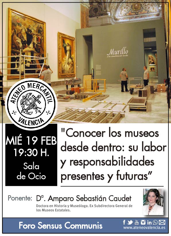 El Foro Sensus Communis regresa a la Sala de Ocio el próximo miércoles 19 de febrero a las 19.30 horas con la ponencia "Conocer los museos desde dentro: su labor y responsabilidades presentes y futuras", que trae al Ateneo Mercatil, la Doctora en Historia y Museóloga. Ex Subdirectora General de los Museos Estatales, Dª. Amparo Sebastián Caudet.