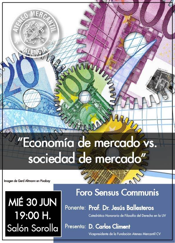 La próxima reunión del Foro Sensus Communis será el miércoles 30 de junio a las 19 horas en el Salón Sorolla y llega con un tema económico de enorme actualidad como es el de hablar de Economía social como contrapuesta a Economía de mercado, para ampliar el paradigma economicista que sólo busca resultados sin importar cómo se consigan. El acto es presencial. El ponente será el Prof. Dr. Jesús Ballesteros, que es un filósofo y jurista español que obtuvo el Premio Extraordinario de Licenciatura en Derecho, y de Doctorado con una tesis sobre Giuseppe Capograssi defendida en la Universitat de València. Desde 1983 es catedrático de Filosofía del Derecho y Filosofía Política en la Facultad de Derecho de esta universidad.