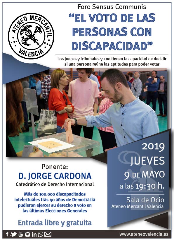 El debate será el próximo jueves 9 de mayo a las 19.30 horas y para encauzar el tema a debatir se ha invitado a D. Jorge Cardona, que es catedrático de derecho internacional. Y es que los jueces y los tribunales ya no tienen la capacidad de decidir si una persona reúne o no las aptitudes necesarias para poder votar.