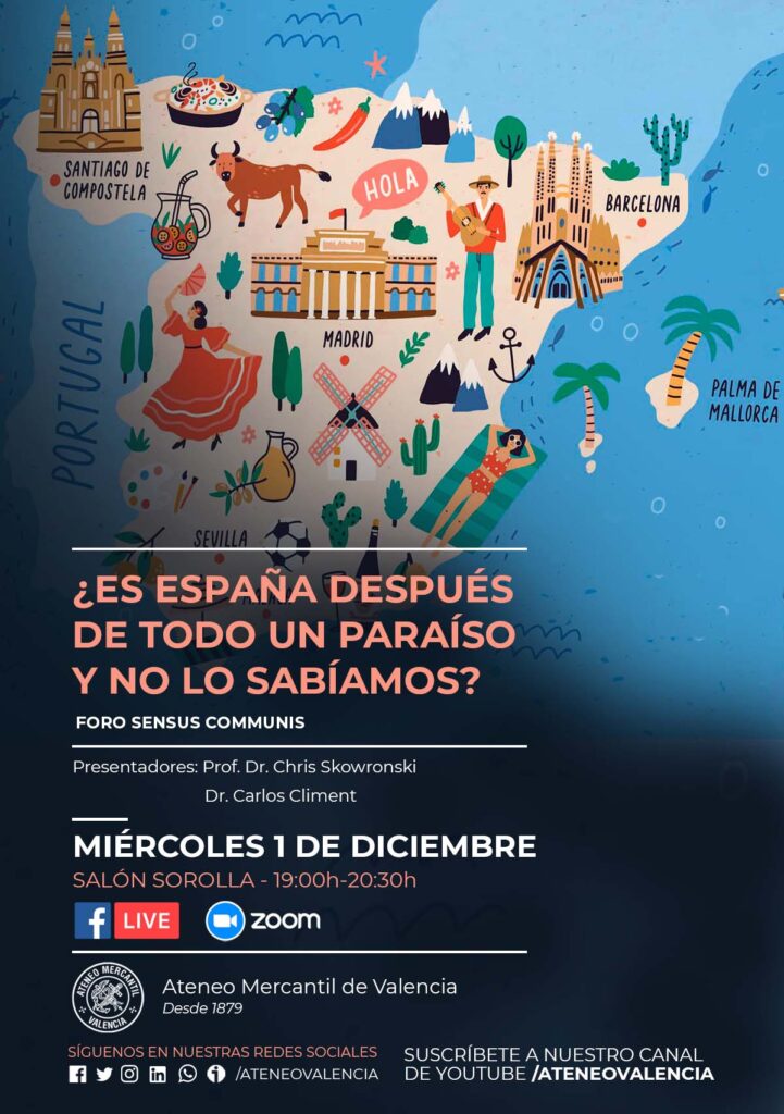 El Foro Sensus Communis regresa al Ateneo Mercantil de Valencia el próximo miércoles 1 de diciembre a las 19 horas en el Salón Sorolla con una conferencia que será presencial y online. La conferencia llega bajo el título "¿Es España después de todo un paraíso y no lo sabíamos?" y el ponente será el Prof. Dr. Chris Skowronski, profesor del Departamento de Estudios Culturales de la Universidad de Opole y Maneger del Berlin Practical Philosophy International Forum e. V. Mientras que el moderador del acto y presentardor será el Dr. Carlos Climent, magistrado, Doctor en Derecho y Licenciado en Criminología.