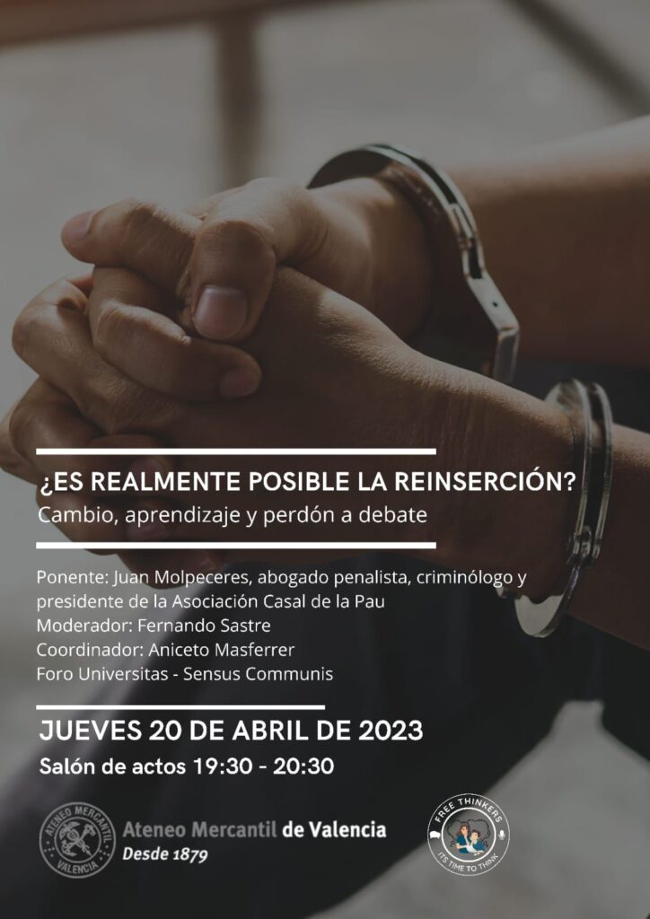 Este próximo jueves 20 de abril de 2023 retomamos las sesiones del Foro Universitas-Sensus Communis y de FreeThinkers en el Ateneo Mercantil de Valencia. El invitado será el abogado penalista, criminólogo y presidente de la Asociación Casal de la Pau, Juan Molpeceres. La sesión llega bajo el título "¿Es realmente posible la reinserción", en donde se abordará la cuestión de la reinserción de personas que salen de prisión sin apoyo familiar ni recursos económicos.