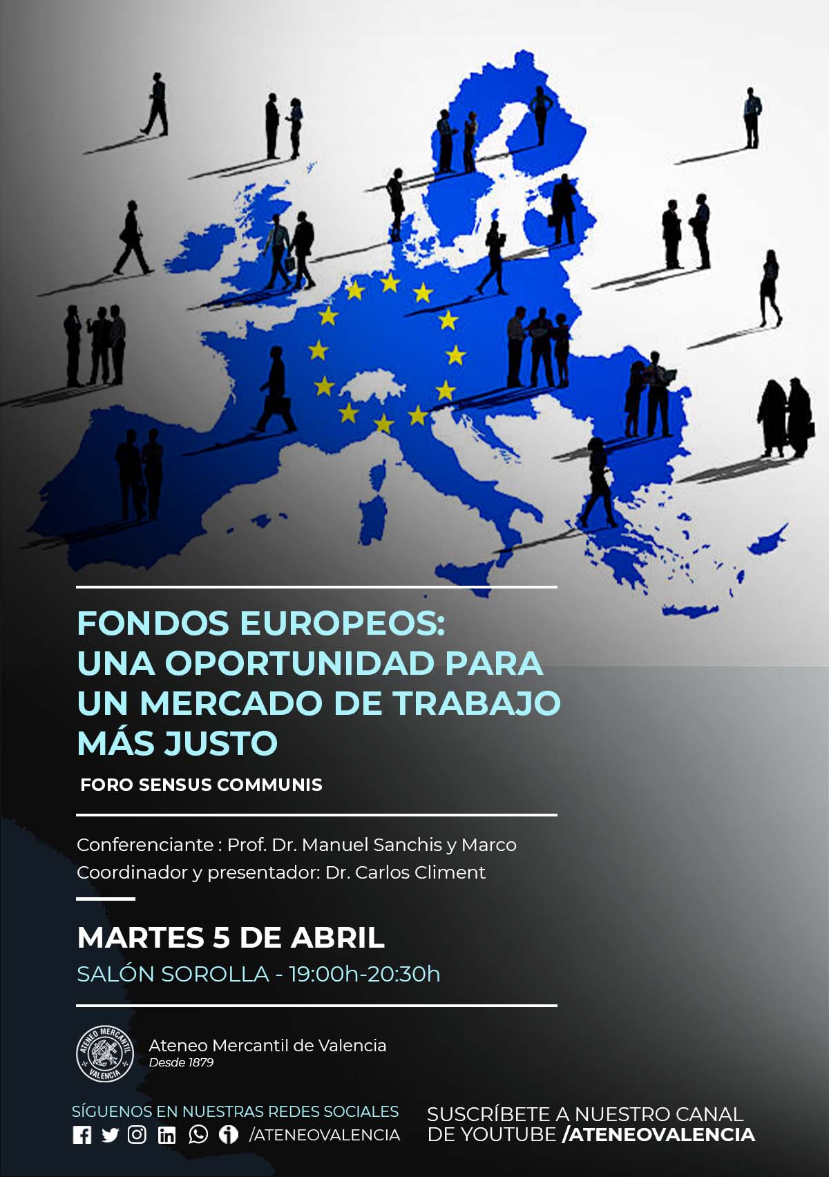El Foro Sensus Communis se reune el próximo martes 5 de abril a las 19 horas en el Salón Sorolla del Ateneo Mercantil de Valencia para debatir en torno a los fondos europeos y el mercado laboral de nuestro país. La conferencia se titula "Fondos europeos: una oportunidad para un mercado de trabajo más justo" y el ponente será el Prof. Dr. Manuel Sanchis i Marco, Doctor Cum Laude, y Premio Extraordinario de Doctorado en Ciencias Económicas por la Universidad de Valencia y Profesor Titular de Economía Aplicada de la UV. Es Máster en Ética y Democracia, y Doctor Cum Laude, mención internacional, en Filosofía por la UV.