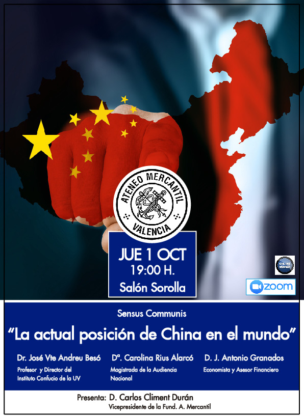 En la nueva sesión del Sensus Communis se tratará sobre China y su posición dominante en el mundo actualmente, para ello se ha invitado a tres personalidades que conocen a la perfección el tema como son el Dr. Vicent Andreu Besó, Profesor y Director del Instituto Confucio de la Universitat de Valencia, Dª. Carolina Rius Alarcó, Magistrada de la Audiencia Nacional y D. José Antonio Granados, Economista y Asesor Financiero. Esta nueva reunión del Foro Sensus Communis será el próximo jueves 1 de octubre y se podrá seguir de manera presencial en el Salón Sorolla del Ateneo Mercantil y se podrá seguir on line por la Plataforma Zoom.