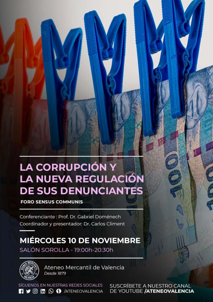 Nueva reunión del Foro Sensus Communis el próximo miércoles 10 de noviembre a las 19 horas en el Salón Sorolla y llega con el título "La corrupción y la nueva regulación de sus denunciantes". El ponente será el Prof. Dr. Gabriel Doménech, que es catedrático de Derecho Administrativo de la Universitat de València.