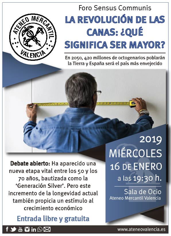 El próximo miércoles 16 de enero regresa el Foro Sensus Communis con un nuevo debate abierto sobre un interesante tema como es el del envejecimiento de la población mundial y en concreto de España, que será el país más anciano en el año 2050. El debate será a las 19.30 horas en la Sala de Ocio. Las previsiones de la ONU dibujan un 2050 con 420 millones de octogenarios habitando el planeta Tierra y, según la OCDE, España será el territorio más envejecido del mundo también para ese año. No hay quien pare a la esperanza de vida. ¿Qué supondrá este escenario?