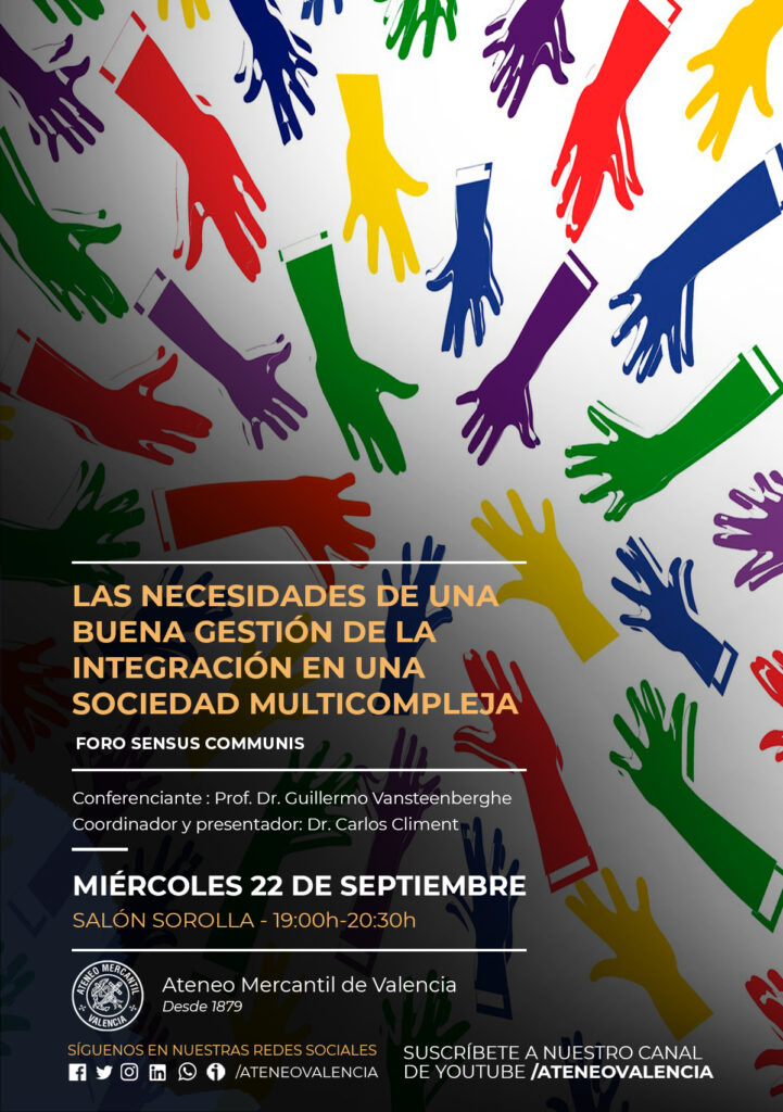 El Foro Sensus Communis vuelve a reunirse el próximo miércoles 22 de septiembre a las 19 horas en el Salón Sorolla del Ateneo Mercantil de Valencia, en un encuentro presencial para tratar un tema sobre inmigración y su integración en las sociedades receptoras y para ello contará con la presencia del Prof. Dr. Guillermo Vansteenberghe para explicarnos el manual para una buena gestión de los flujos migratorios e integración de las personas.