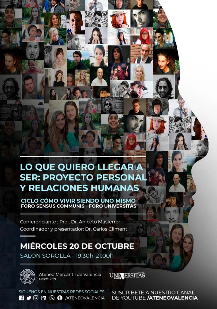 El Foro Sensus Communis regresa al Ateneo Mercantil el próximo miércoles 20 de octubre a las 19.30 horas en el Salón Sorolla con la segunda conferencia del Ciclo Cómo vivir siendo uno mismo que organizan el Foro Sensus Communis junto al Foro Universitas de Análisis Social y que llega bajo el título "Lo que quiero llegar a ser: proyecto personal y relaciones humanas". El ponente será Aniceto Masferrer que es Catedrático de Historia del Derecho y de las Instituciones en la Universitat de València.