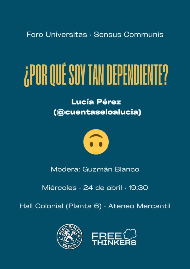 El Ateneo Mercantil de Valencia en colaboración con el Foro Universitas de Análisis Social y Free Thinkers han organizado una nueva sesión del Foro Sensus Communis en el Hall Colonial de la sexta planta del Ateneo. Una sesión en la que que regresa una de sus principales conferenciantes, la psicóloga, Lucía Pérez (@cuentaseloalucia) y que llega bajo el título "¿Por qué soy tan dependiente?".