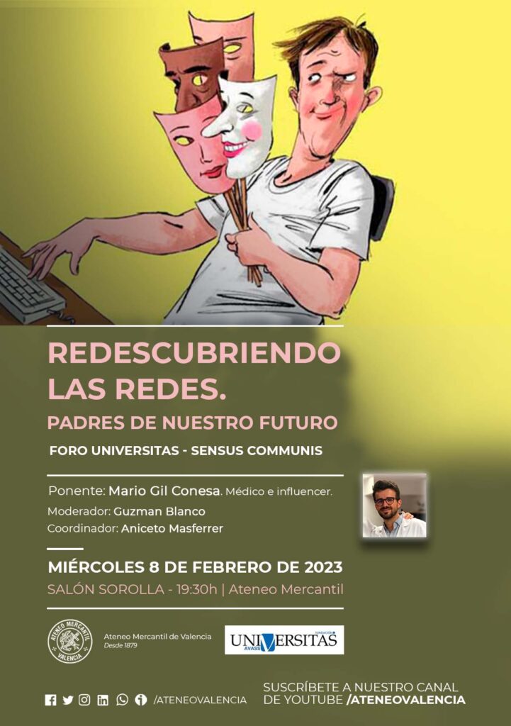 El Foro Sensus Communis en coordinación con el Foro Universitas de Análisis Social organizan un nuevo encuentro en el que se analizará el uso de las redes sociales en la sociedad. Bajo el titulo "Redescubriendo las redes. Padres de nuestro futuro", el médico e influencer Mario Gil Conesa nos hablará de como creció en redes, qué le lleva a subir el contenido que sube, cómo compagina su faceta de influencer con su faceta como médico, y cómo las redes están cambiando a las personas y las formas de hacer las cosas, resaltando desde su punto de vista como médico e influencer, los aspectos que considera positivos y negativos de este nuevo escenario.
