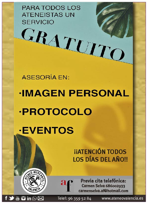 Los socios del Ateneo Mercantil de Valencia están de enhorabuena porque la Asesoría de Imagen Personal AF – Carmen Selva presta su servicio todos los días del año, para ayudar a resolver las duda o los consejos que necesiten los socios ateneístas para cualquier acto o evento que tengan que organizar. Es un servicio de Asesoría de Imagen Personal y de Protocolo para todos los ateneístas que se formaliza con cita previa telefónica al 686.00.29.33 o bien escribiendo un email a carmenselva.af@hotmail.com. Recuerda que la atención es todos los días del año.
