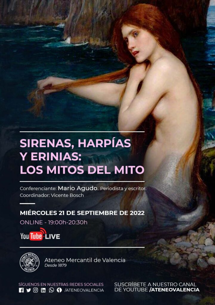 Como en el resto de las culturas, la griega adaptó elementos de otras civilizaciones para formar la suya propia. El origen de las sirenas no se encuentra en la mitología clásica, estos seres fabulosos provienen de la cultura oriental, posiblemente adoptadas del antiguo Egipto o del Próximo Oriente. Lo mismo ocurre con las Harpías y las Erinias. La conferencia llega el próximo miércoles 21 de septiembre a las 19 horas, en Online (se podrá seguir por el Canal de Youtube del Ateneo Mercantil), y el ponente será el periodista y escritor, Mario Agudo.