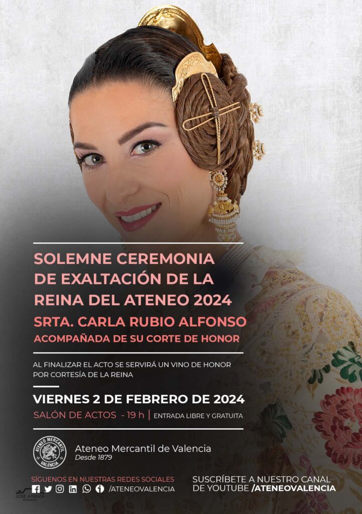 El pistoletazo de salida de las Fallas en el Ateneo Mercantil de Valencia se dará este viernes 2 de febrero con el solemne acto de Exaltación de la Reina del Ateneo 2024, la Srta. Carla Rubio Alfonso. Así, ese viernes a las 19 horas en el Salón de Actos arrancan unos emotivos festejos que son especiales para todos los socios y falleros.