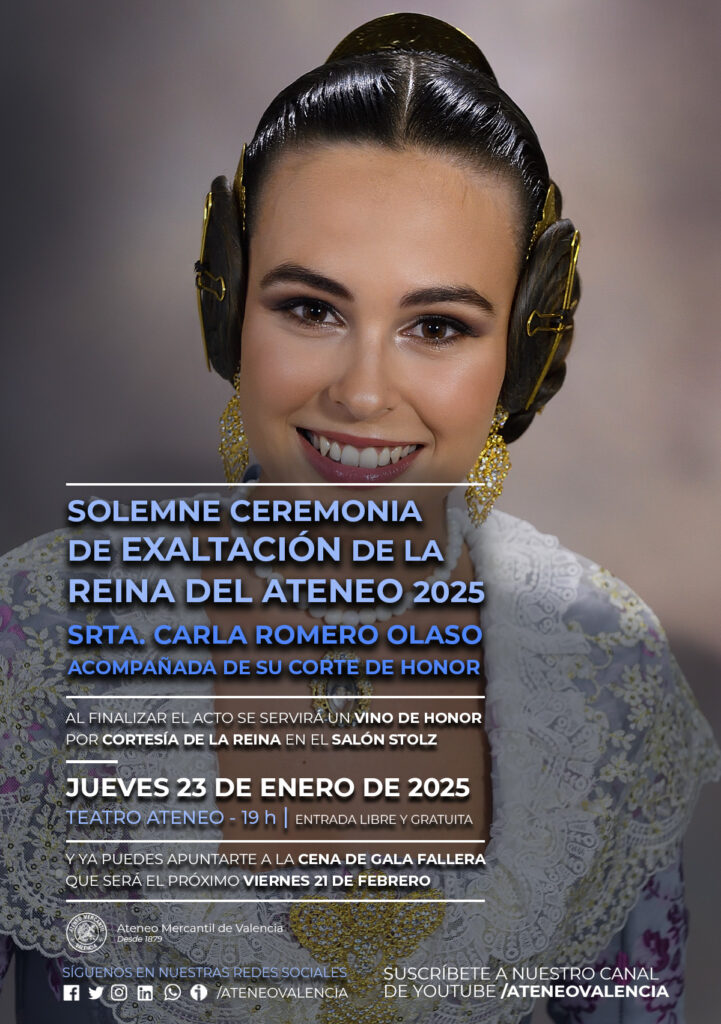 En este magno acto, tendremos el honor de proclamar a la Srta. Carla Romero Olaso como Reina del Ateneo 2025, quien estará acompañada por su Corte de Honor. Esta ceremonia es una oportunidad única para dar la bienvenida a nuestra nueva soberana, deseándole un reinado lleno de éxitos y alegría.