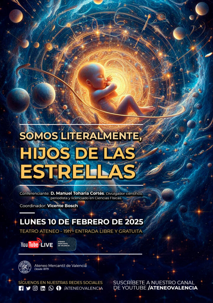 Bajo el inspirador título "Somos literalmente Hijos de las Estrellas", Toharia ofrecerá una profunda reflexión sobre el origen y la evolución de la materia y la energía, explorando cómo nuestra existencia está íntimamente ligada al cosmos. En esta conferencia, el divulgador compartirá no solo su experiencia, sino también los libros y conceptos que han sido clave en la construcción de su particular visión científica y filosófica del universo, entre ellos su propia obra, "Hijos de las Estrellas".