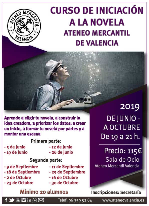 El Ateneo Mercantil de Valencia ofrece a sus socios un curso de iniciación a la novela para un máximo de 20 alumnos. El objetivo es ofrecer las herramientas necesarias a los alumnos para que sean capaces, por si mismos, de comenzar a escribir una buena novela. La fecha de inicio del taller será el 5 de junio y el fin de proyecto será el 30 de octubre de 2019, siempre de 19 a 21 horas en la Sala de Ocio y el curso constará de dos partes: