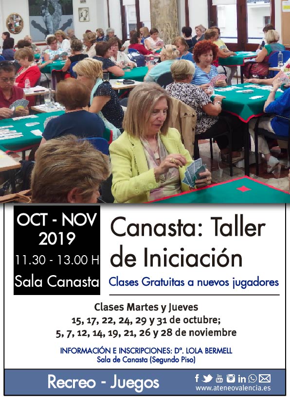 La coordinadora del juego de la Canasta en el Ateneo Mercantil de Valencia, Lola Bermell, impartirá clases Gratuitas dentro del Taller de Iniciación de Canasta para nuevos jugadores. Para las inscripciones y toda la información que precisen hay que preguntar por Lola en la Sala de Canasta. Si está interesado en conocer de cerca el juego de la Canasta no lo dudes más y apúntate a este instructivo Taller. Recuerda que las clases (14 sesiones) serán todos los martes y jueves desde el 15 de octubre hasta el 28 de noviembre por las mañanas de 11.30 a 13 horas en la Sala de Canasta. Fecha límite para apuntarse el lunes 14 de octubre.