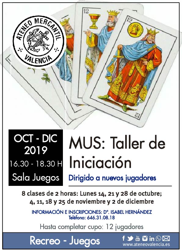 Comienza a jugar y verás su enorme entretenimiento. Este taller pretende acercar el Mus, mediante la explicación de sus normas, a aquellos que deseen aprender a jugar, además de poder servir para ir desarrollando el juego semana a semana una vez se aprendan las normas básicas. Todos los lunes de octubre a diciembre: Primera sesión el 14 de octubre y la última, el 2 de diciembre.