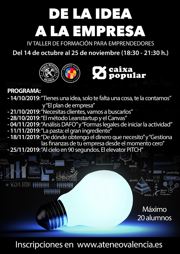 La sexta sesión del Taller de la Idea a la Empresa que organiza el Ateneo Club de Innovación y Empresa junto al patrocinio de Caixa Popular será el próximo lunes 18 de noviembre a las 18.30 horas en la Sala de Ocio del Ateneo Mercantil. Antes de lanzarse a pedir dinero, conviene pararse a pensar cuál es nuestro modelo de negocio, porque esa reflexión ayuda a dirigir los pasos hacia el tipo de financiación que mejor se ajuste al proyecto y luego viene el modelo de financiación de la empresa desde el propio arranque del proyecto.
