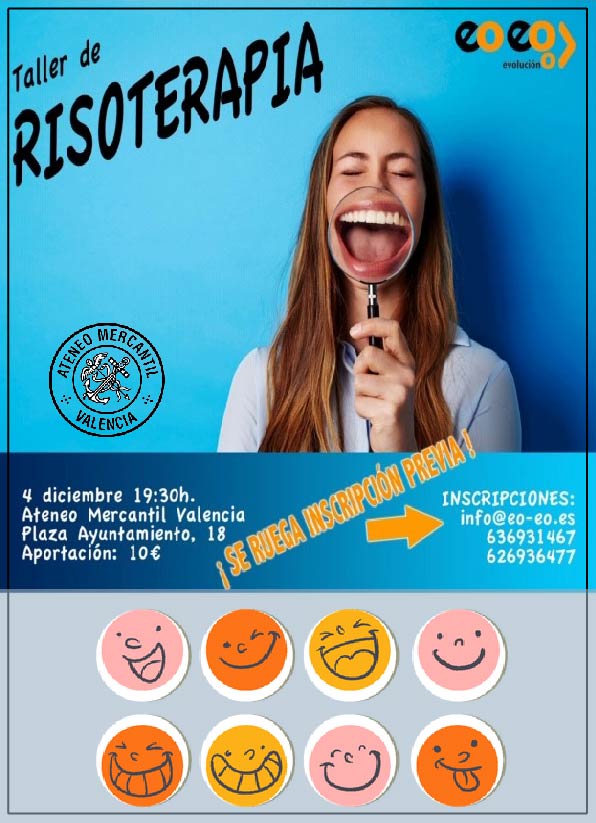 Si lo que quieres es pasar un buen rato, divertido y de risas tienes una cita en el Ateneo Mercantil de Valencia el próximo miércoles 4 de diciembre a las 19.30 horas. Ven al segundo taller de Risoterapia y descubre los increíbles beneficios de la risa. Un taller que es apto para todos los públicos y tiene una aportación de 10 euros. Si quieres asistir recuerda que puedes apuntarte en el correo info@eo-eo.es, bien llamando o enviando un whatsapp al 636931467 / 626936477. Organizado por eo-eo evolucinO.