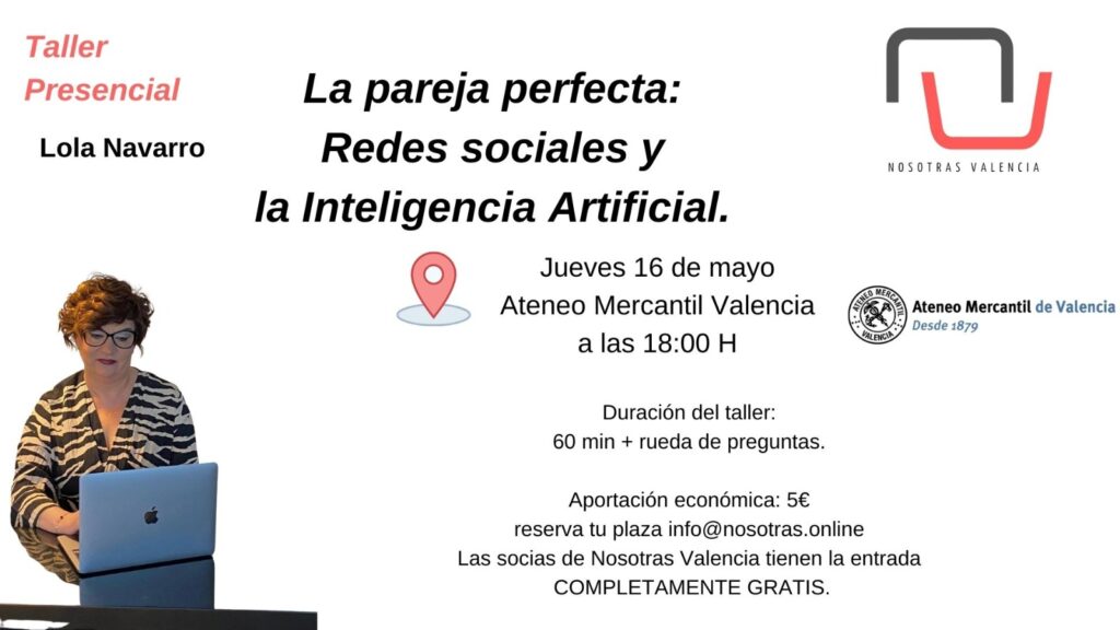 La Asociación Nosotras Valencia organiza un taller presencial "La Pareja Perfecta: Redes Sociales y la Inteligencia Artificial" impartido por Lola Navarro, el próximo jueves 16 de mayo a las 18 horas en la Sala de Ocio del Ateneo Mercantil de Valencia. El coste para asistir al taller es de 5 euros. Para las personas socias de Nosotras Valencia es gratis.