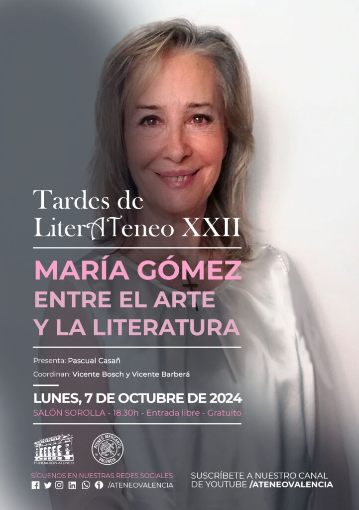 La vigésimo segunda edición de Tardes de LiterAteneo, el ciclo de literatura que coordinan Vicente Bosch y Vicente Barberá Albalat, llega el próximo lunes 7 de octubre de 2024 al Salón Sorolla del Ateneo Mercantil. Un nuevo encuentro que en esta ocasión será con la Prof. Dra. María Gómez y llega bajo el título "Entre el arte y la literatura". El presentador será Pascual Casañ. Un evento que organiza la Fundación del Ateneo Mercantil de la CV.