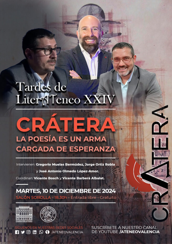 La vigésimo cuarta edición de Tardes de LiterAteneo, el ciclo de literatura que coordinan Vicente Bosch y Vicente Barberá Albalat, llega el próximo lunes 12 de diciembre de 2024 al Salón Sorolla del Ateneo Mercantil. Un nuevo encuentro en el que se pondrá en primer plano la importante labor de CRÁTERA Revista de crítica y poesía contemporánea que edita la Asociación Literaria Cratarroja. Llega bajo el título: Crátera. La poesía es un arma cargada de esperanza.