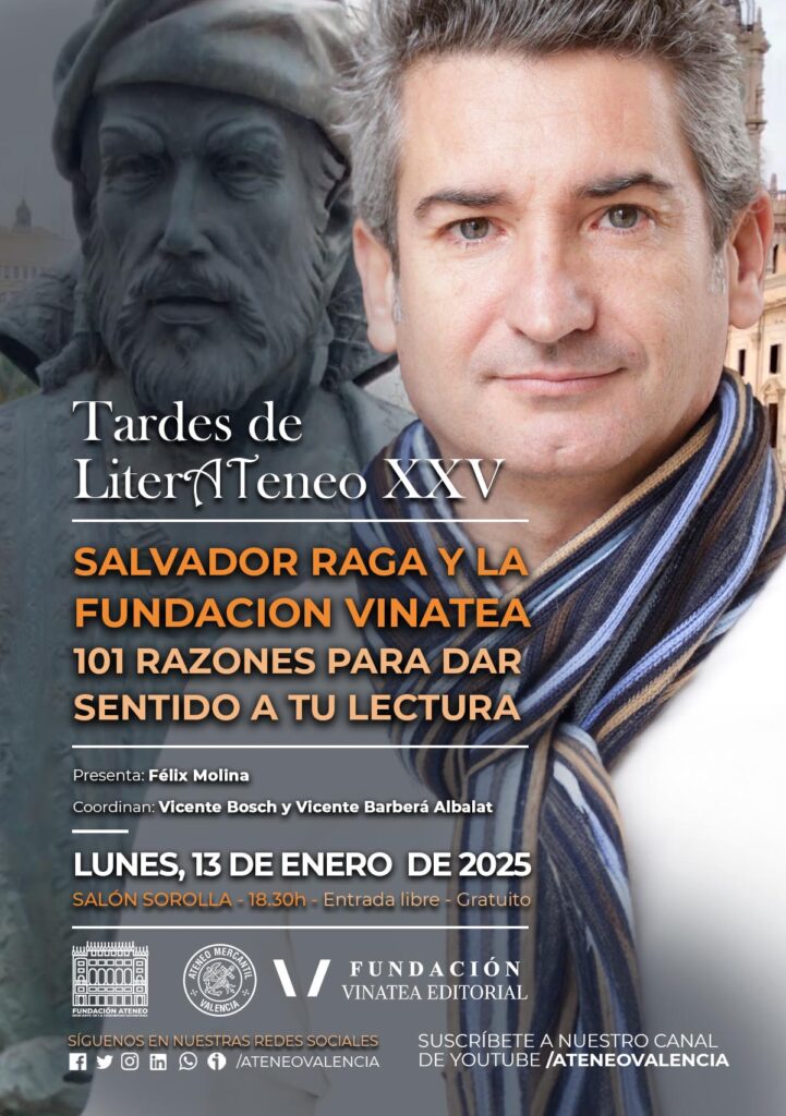Bajo el título "Salvador Raga y la Fundación Vinatea. 101 razones para dar sentido a tu lectura", exploraremos cómo la Fundación Vinatea Editorial trabaja para combinar la pasión por la lectura y la cultura con proyectos solidarios. Esta organización no sólo fomenta la edición de libros y conferencias que destacan aspectos de la cultura valenciana, sino que también destina los recursos obtenidos a financiar proyectos sociales en diferentes partes del mundo, mostrando el impacto transformador de la cultura y la solidaridad.