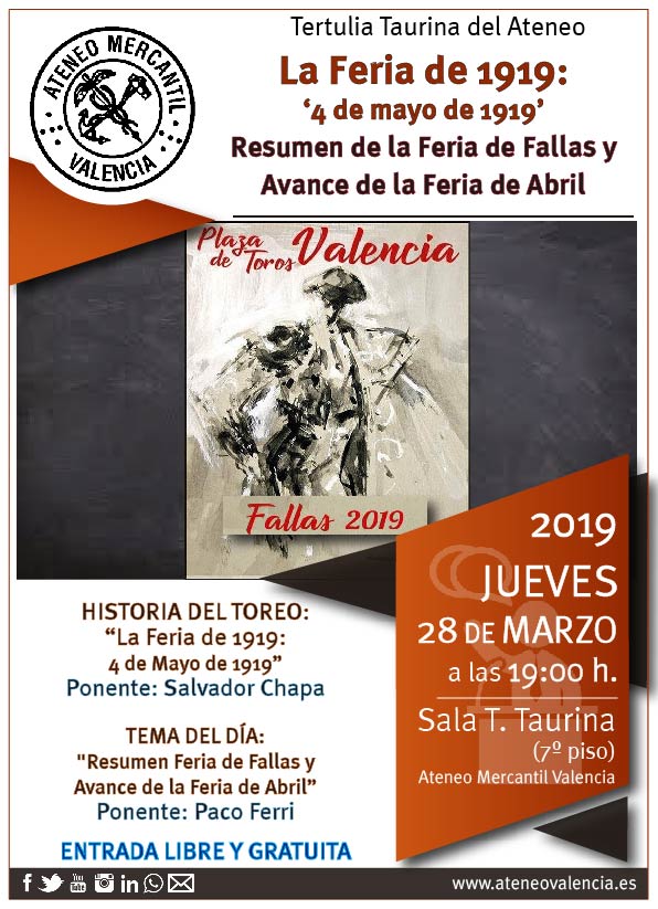 Nuevo encuentro de la Tertulia Taurina del Ateneo Mercantil este jueves 28 de marzo en el séptimo piso de nuestro edificio. Una tertulia que se desarrollará con el siguiente formato: primero D. Salvador Chapa recuperará la Historia del Toreo y desarrollará dentro de la Feria de 1919, el tema sobre "El 4 de Mayo de 1919". Además, D. Paco Ferri, informará de las noticias más destacadas de la semana, además, de hacer un extenso resumen de la Feria de Fallas y avance de la Feria de Abril de Sevilla. El moderador será Nicasio Jiménez.