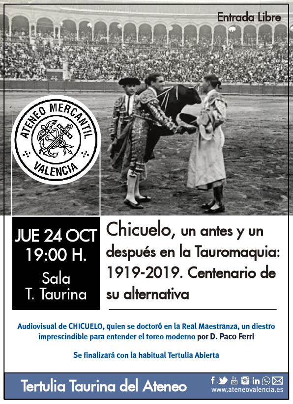La Tertulia Taurina del Ateneo Mercantil se reúne de nuevo este jueves 24 de octubre en el que se hará un especial sobre el centenario de la alternativa de Chicuelo. Así, en horario y en el lugar habitual, a las 19 horas en el séptimo piso del edificio se proyectará un audiovisual de Manuel Jiménez "Chicuelo" y será comentado por D. Paco Ferri. Este 2019 se celebra el centenario de la alternativa del maestro, fue en la Real Maestranza, Juan Belmonte, que hizo las veces de padrino, le cedió los trastos al torero de la Alameda de Hércules, en presencia de Manuel Belmonte. Aquel toro del conde Santa Coloma, 'Vidriero', fue el primero de su exitosa y larga carrera profesional. Tras la proyección del audiovisual se comentará el vídeo y celebrará la habitual Tertulia Abierta de todos los jueves en la que se tratarán diversos temas de actualidad del mundo del toro.