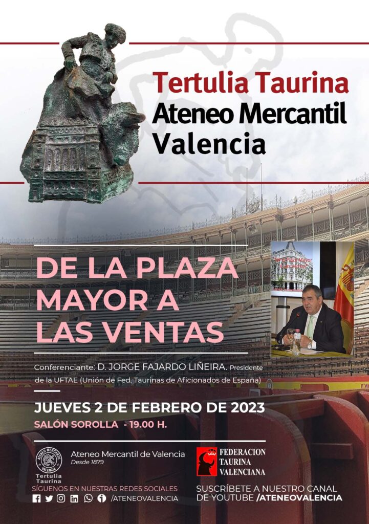 La Tertulia Taurina del Ateneo Mercantil de Valencia en colaboración con la Federación Taurina Valenciana ha programado una conferencia para el próximo jueves 2 de febrero a las 19 horas en el Salón Sorolla con el presidente de la UFTAE, la Unión de Federaciones Taurinas de Aficionados de España, D. Jorge Fajardo Liñeira, en la que nos hablará sobre la evolución de los toros en la Comunidad de Madrid. Así la conferencia "De la Plaza Mayor a Las Ventas" está enmarcada en conmemoración del 90 aniversario de la inauguración de la Plaza de las Ventas que se cumplió hace un año.