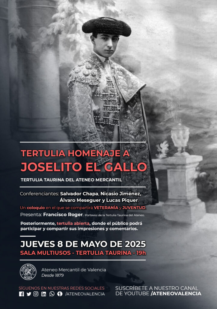 La Tertulia Taurina del Ateneo les invita este próximo jueves 8 de mayo de las 19 horas al Ciclo Jueves Taurinos del Ateneo a una Tertulia donde se homenajeará a una de las grandes figuras de la tauromaquia como fue Joselito El Gallo en su 105 aniversario de su trágica muerte en Talavera. Una Tertulia que contará con cuatro voces autorizadas, cuatro estilos diferentes y cuatro visiones sobre el maestro, en la que se mezclará la veteranía y la juventud.