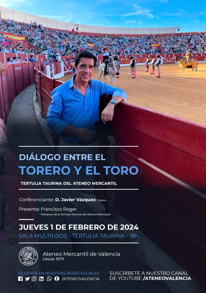 La Tertulia Taurina del Ateneo Mercantil de Valencia en su reunión habitual de los jueves, contará este 1 de febrero a las 18 horas en la Sala Multiusos-Tertulia Taurina con la presencia del torero, D. Javier Vázquez, quien desarrollará una conferencia a los presentes sobre el "Diálogo entre el torero y el toro". La relación del torero con el toro en la plaza depende muchas veces del animal pero siempre hay diálogo a través de gestos. Los toros no tienen visión frontal y se cree que hay un momento en el que el toro no ve al torero. A continuación se realizará la habitual tertulia abierta.