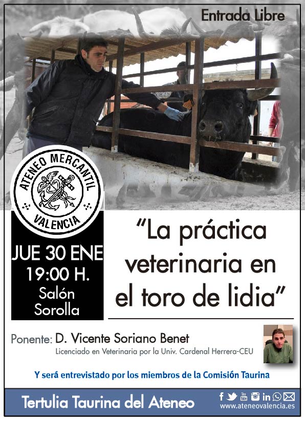 La próxima Tertulia Taurina del Ateneo Mercantil tendrá un invitado especial, ya que el próximo jueves 30 de enero a las 19 horas desfilará por el Salón Sorolla el licenciado en Veterinaria por la Universidad Cardenal Herrera-CEU, D. Vicente Soriano Benet, quién traerá un tema muy interesante como es el de la práctica veterinaria en el toro de lidia. Será entrevistado por los integrantes de la Comisión Taurina de la Tertulia Taurina del Ateneo.