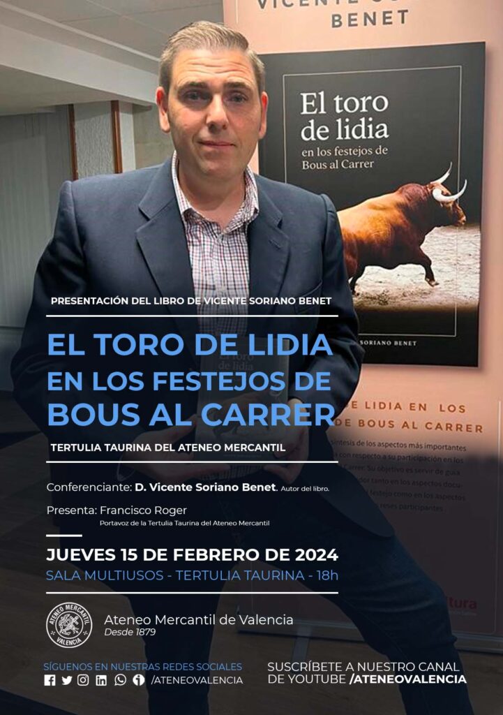 La Tertulia Taurina del Ateneo Mercantil ha organizado la presentación del libro de Vicente Soriano Benet, "El Toro de Lidia en los festejos de Bous al Carrer" el próximo jueves 15 de febrero a las 18 horas en la Sala Multiusos-Tertulia Taurina (7ª planta). La tradicional tertulia se realizará comentando el libro presentado.