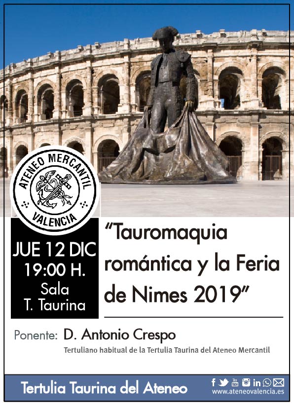 La última cita de la Tertulia Taurina del Ateneo Mercantil de Valencia del año 2019 llega este jueves 12 de diciembre a las 19 horas en el séptimo piso del edificio y lo hace bajo el título “Tauromaquia romántica y la Feria de Nimes 2019” que será ofrecida por el tertuliano habitual D. Antonio Crespo.