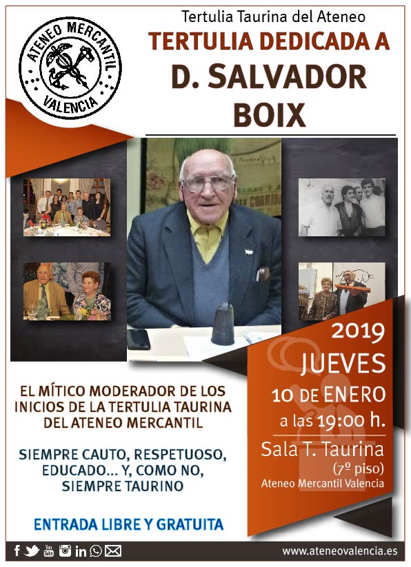 D. Salvador Boix recibió ya un homaneje de la Tertulia Taurina hace unos años en el Restaurante del Ateneo Mercantil, pero en esta ocasión se hablará durante toda la reunión de su figura y de todo lo que representó para este grupo de socios que se reúnen todos los jueves del año. En el Ateneo Mercantil, D. Salvador dejó una huella imborrable por su calidad humana y por la pasión que sentía hacia la tauromaquia. En la tarde del 24 de diciembre falleció a los 90 años. Se marchó un gran aficionado de los toros.