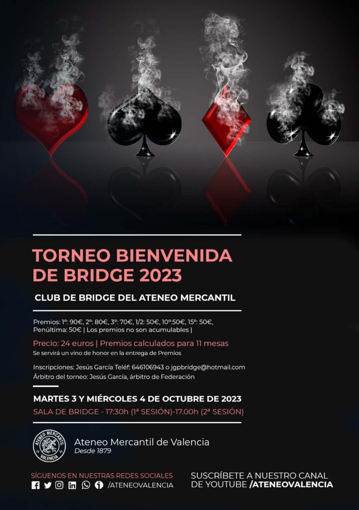 El Club de Bridge del Ateneo Mercantil de Valencia ha programado para el próximo martes 3 y miércoles 4 de octubre de 2023 el Torneo de Bienvenida 2023. La inscripción para el torneo se puede realizar llamando al teléfono 646.10.69.43 (Jesús García) o escribiendo un email a jgpbridge@hotmail.com. El torneo tiene un precio de 24 euros y estará arbitrado por el colegiado federado Jesús García.