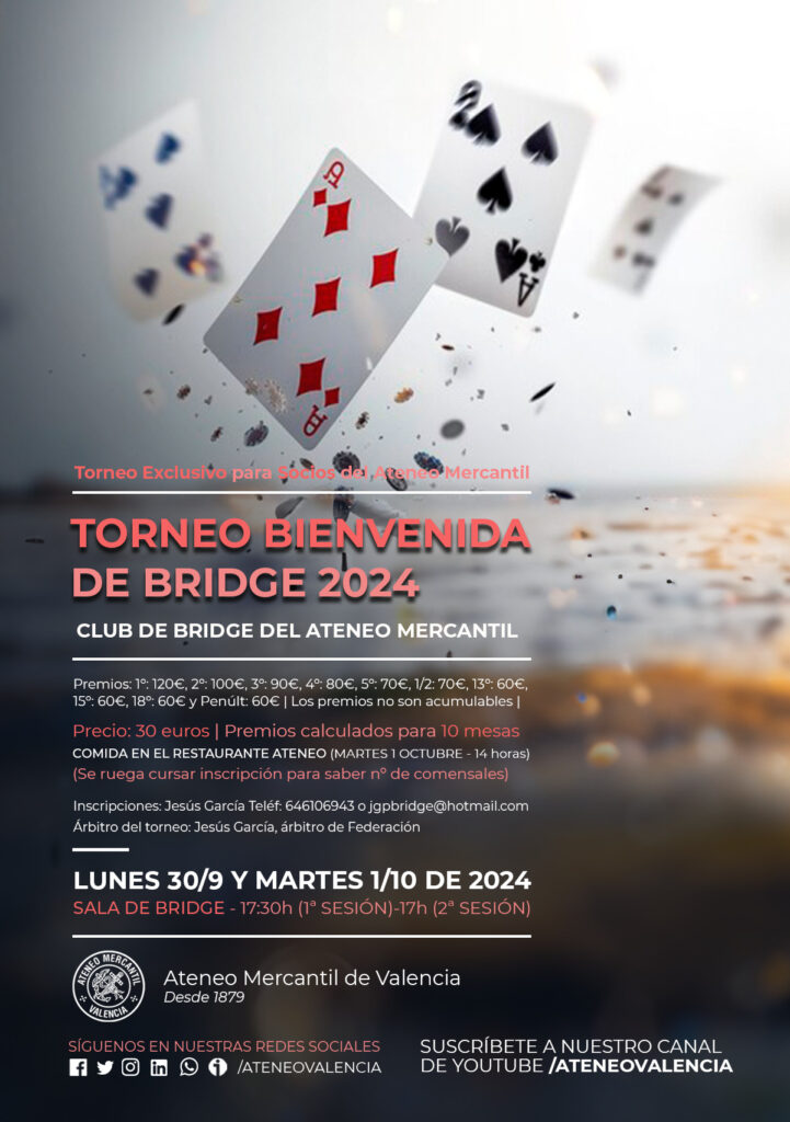 El Club de Bridge del Ateneo Mercantil de Valencia ha programado para el próximo lunes 30 de septiembre y el martes 1 de octubre de 2024 el Torneo de Bienvenida 2024. La inscripción para el torneo se puede realizar llamando al teléfono 646.10.69.43 (Jesús García) o escribiendo un email a jgpbridge@hotmail.com. El torneo tiene un coste de 30 euros y estará arbitrado por el colegiado federado Jesús García. El Torneo es Exclusivo para Socios del Ateneo Mercantil de Valencia.