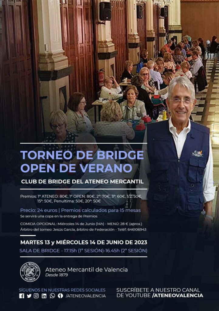 Llega una nueva edición del Torneo de Bridge del Ateneo Mercantil Open Verano 2023. Un torneo habitual que se disputa en nuestra institución y que ha alcanzado una gran relevancia en la ciudad y siempre ha tenido una gran acogida entre los socios.