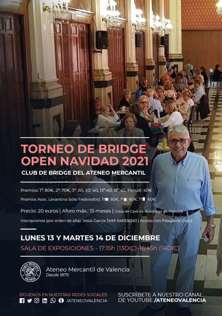 El Club de Bridge del Ateneo Mercantil ha programado de nuevo el tradicional Torneo Open de Navidad 2021 para el lunes 13 y martes 14 de diciembre. La primera sesión arrancará a las 17.15 horas y la segunda sesión será a las 16.45 horas. Recordar que el torneo está estipulado para máximo 15 mesas, por lo que la inscripción se hará en riguroso orden de alta. Para inscribirse se deberá abonar 20 euros y hay que dirigirse a Jesús García, al teléfono 646106943 o en la propia Sala de Bridge (Sala de Exposiciones). Es imprescindible para el acceso al edificio presentar el Pasaporte Covid.